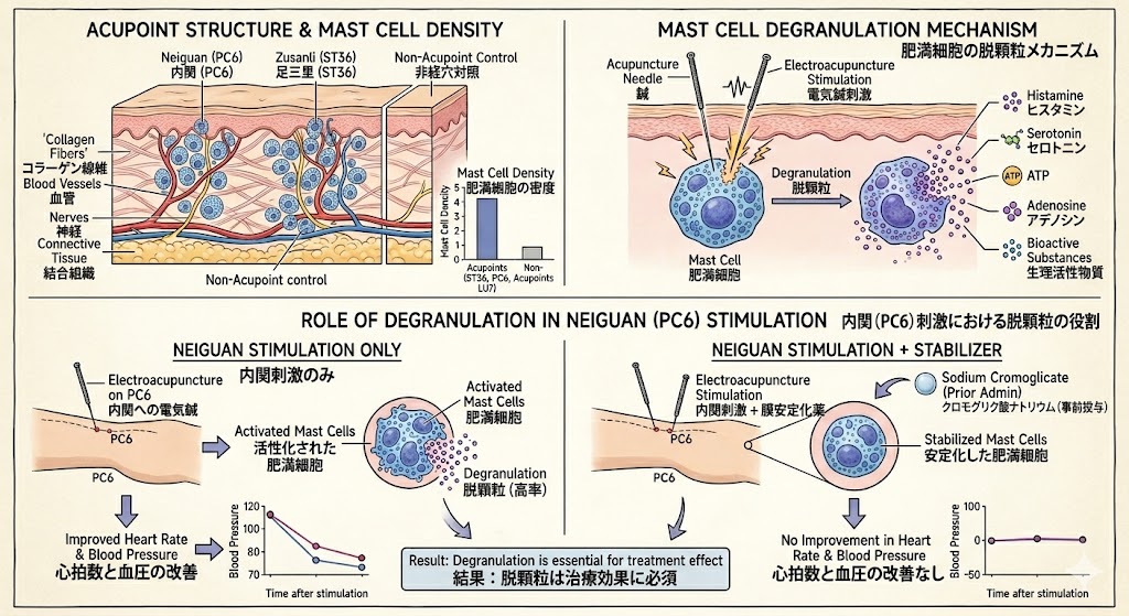興味深いことに、肥満細胞はツボの部位に特に高密度で存在することが、複数の研究で報告されています。ラットの足三里(ST36)というツボでは、周囲の組織と比較して結合組織と筋肉の両方で肥満細胞の密度が高いことが確認されています[3]。内関(PC6)や列缺(LU7)といったツボでも、非経穴と比較して肥満細胞の密度が有意に高いことが示されています。