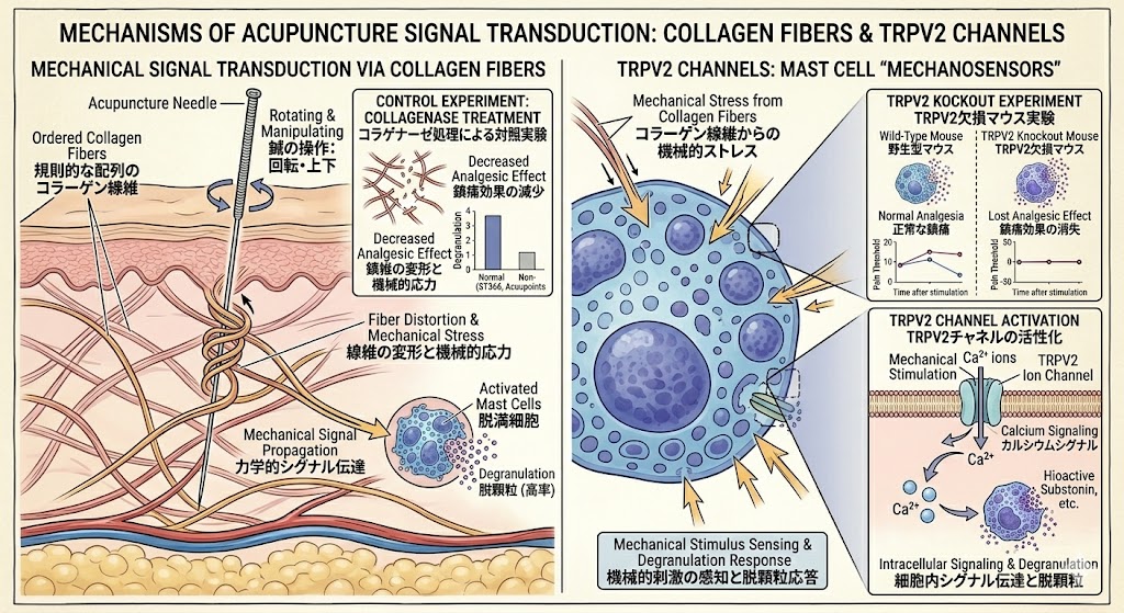 この研究は、TRPV2チャネルが鍼刺激を細胞内シグナルに変換する上で決定的な役割を果たしていることを示しています。肥満細胞は、このチャネルを介して機械的刺激を「感知」し、脱顆粒という形で応答しているのです。
